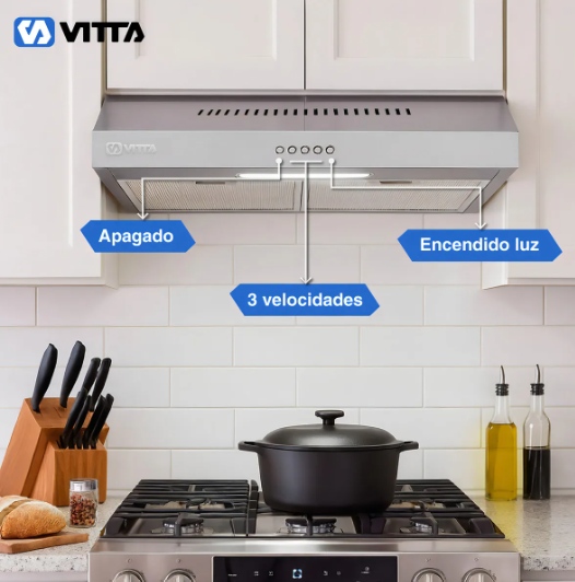 El Extractor Purificador de Cocina Vitta está diseñado para mejorar la ventilación de tu cocina con un funcionamiento potente y silencioso. Su estructura le da un toque moderno, mientras que su sistema de purificación mantiene el ambiente limpio y libre de olores.