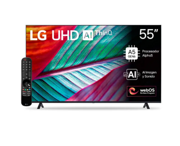 Smart LED AI ThinQ. Pantalla de 55″ 4K UHD (3840×2160). HDR10 Pro: el nivel de brillo se ajusta para mejorar el color y la claridad de cada imagen. Procesador: Alpha5 GEN6. Sistema operativo webOS. Salidas de audio. Potencia RMS: 20W. Conexiones: Wi-Fi. Bluetooth. 2x USB. 3x HDMI. Sintonizador TDA. Gaming con UHD: Nvidia Geforce Now. Tablero optimizador de juegos / ALLM / eARC / HGiG. AI imagen y sonido. Sonido virtual de 5.1 Ch. Soporte VESA: 300×300. Medidas con base (alt x anc x prof): 78 x 123.5 x 23 cm. Peso: 14.1 kg. Incluye control remoto Magic.